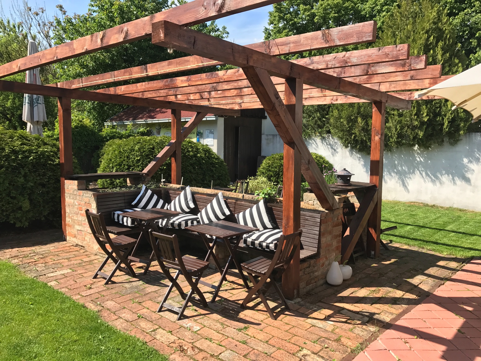 Pergola z prírodného dreva so zákutiami a zelenými zónami v blízkosti pre voľno-chvílové aktivity